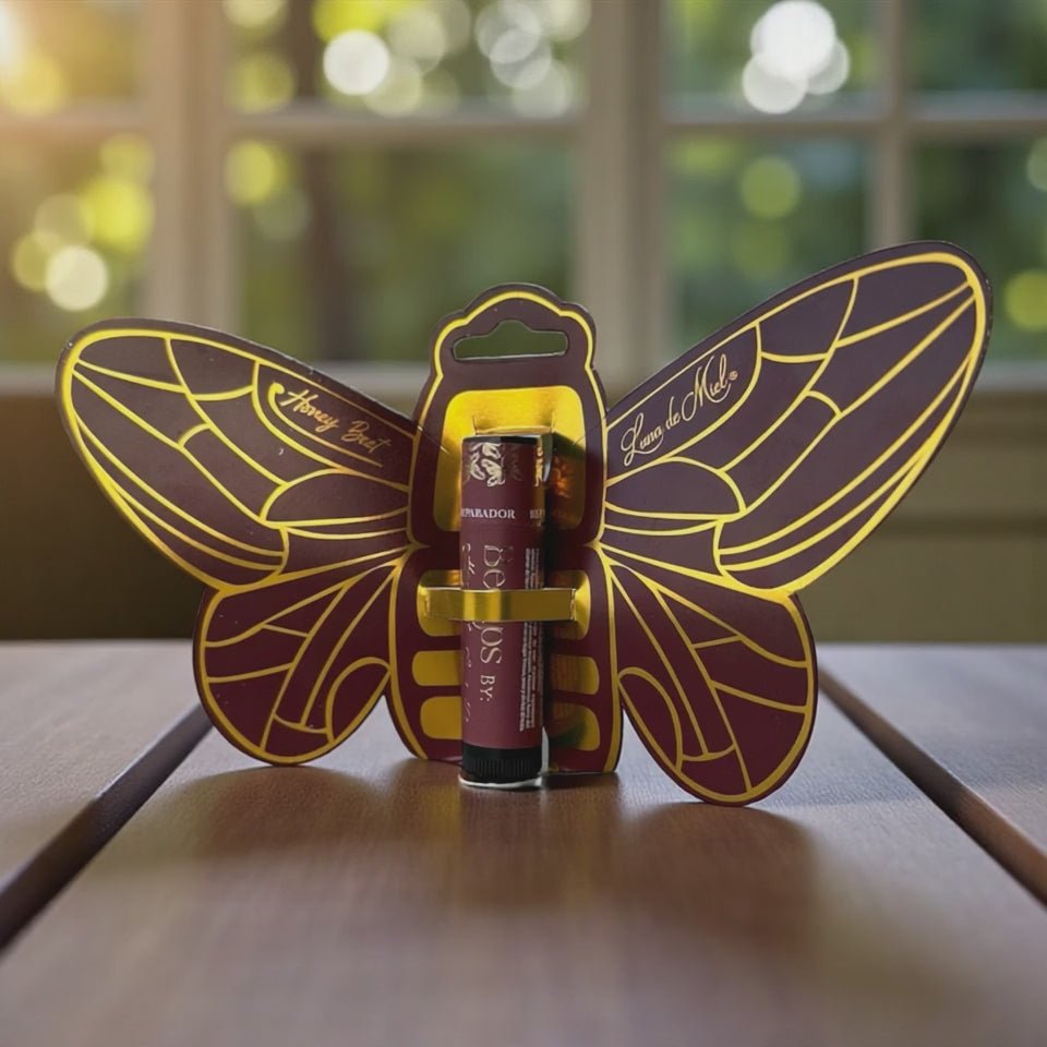 Ingredientes activos: Cera de abejas pura, miel, propóleo, jalea real, aceites de aguacate y almendras, aceites esenciales (menta, lavanda, tea tree, eucalipto), vitamina E y pigmento natural rojo.
