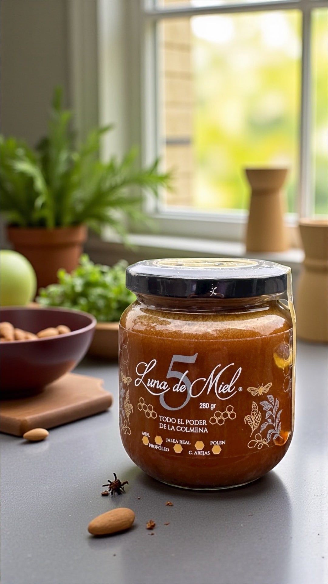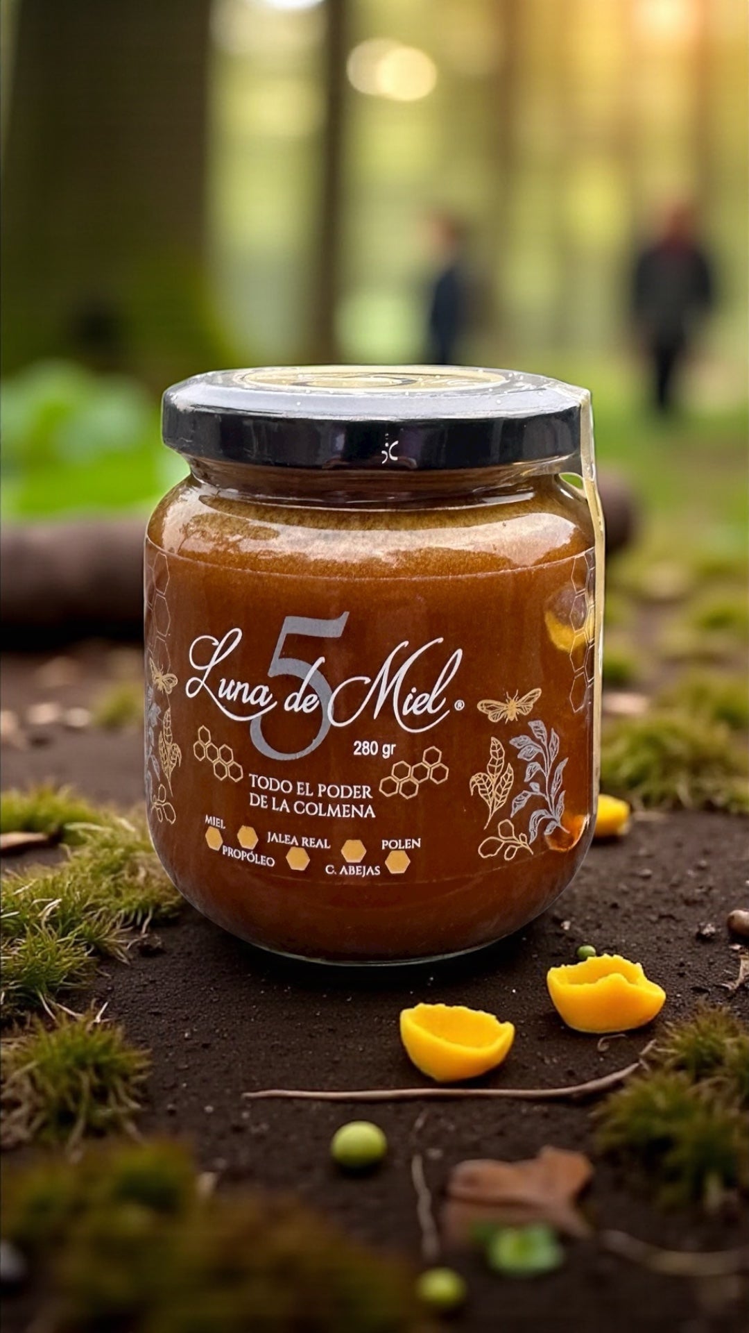 “5” reúne los cinco tesoros más poderosos de la colmena: miel pura, polen, jalea real, propóleo y pedacitos de panal de abeja.