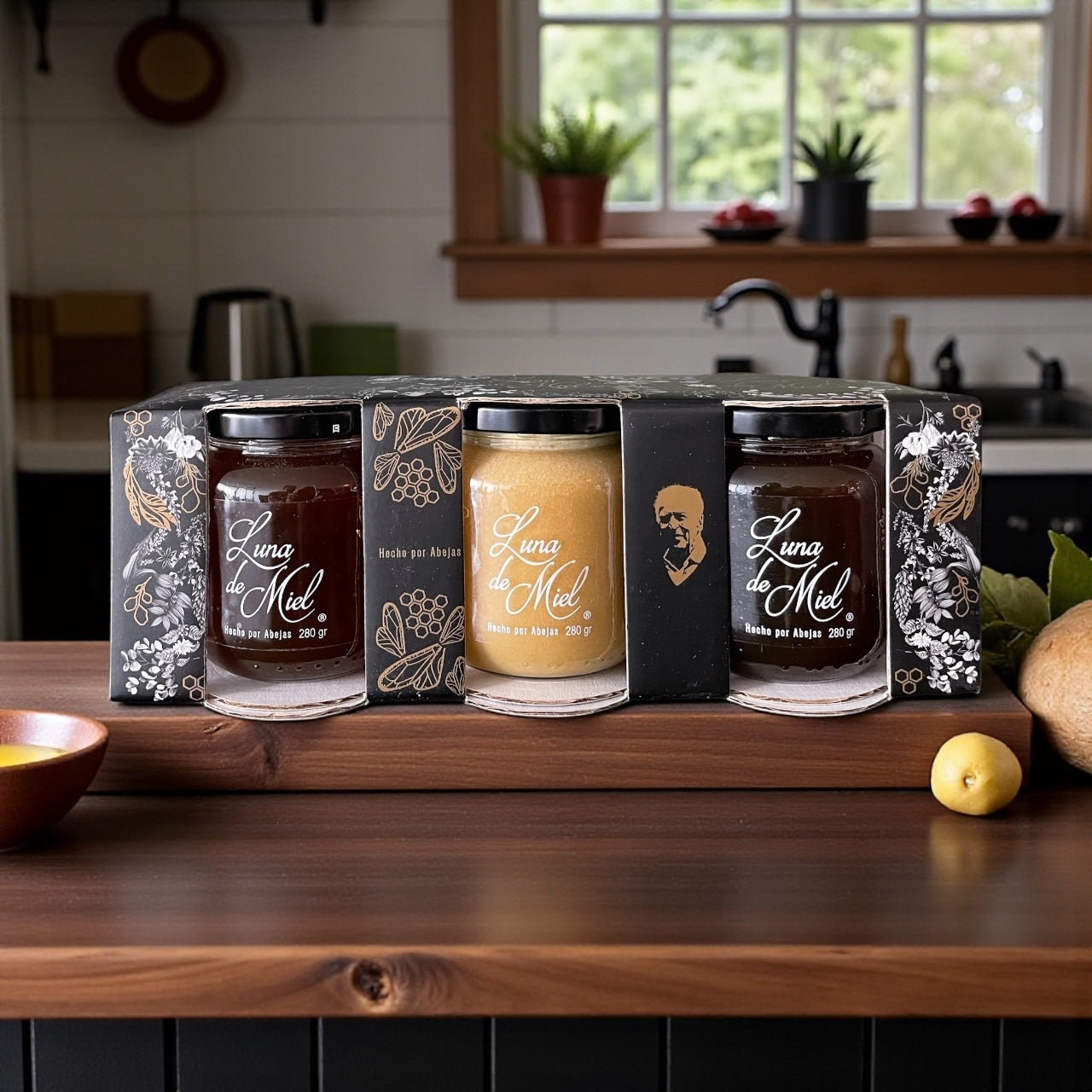 Tres mieles cremadas de 280g cada una. 100% orgánico en elegante caja de regalo.